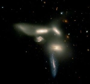 The sixth supposed member, PGC 56579, is not an independent galaxy at all: it is a tidal tail of stars stripped from PGC 56575 by the violent gravitational interactions that govern the life of this remarkable system.