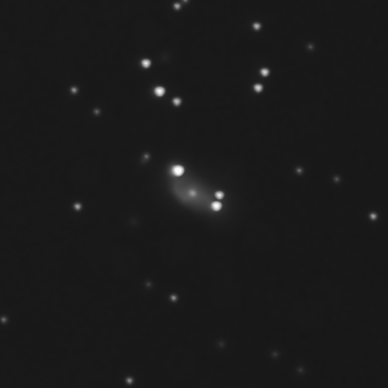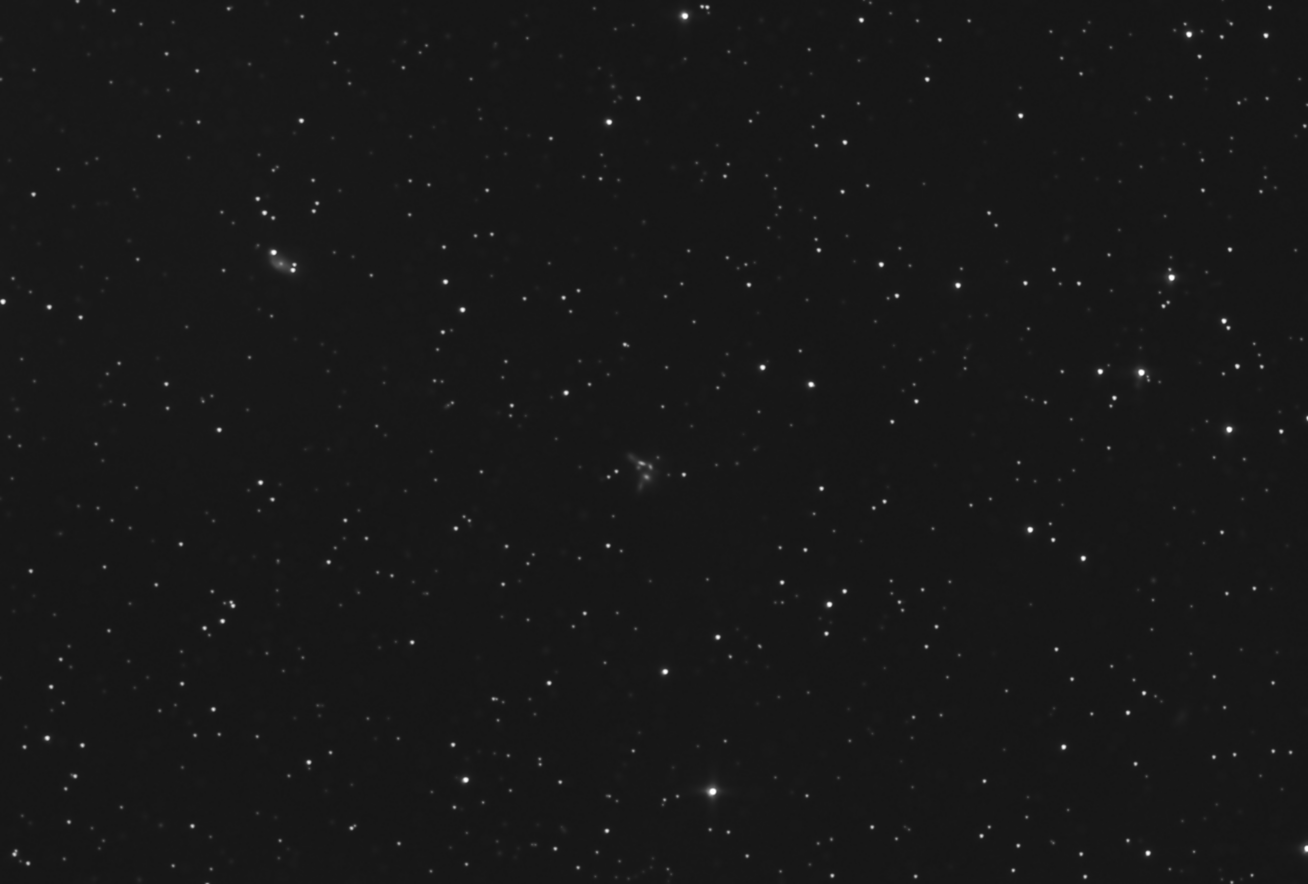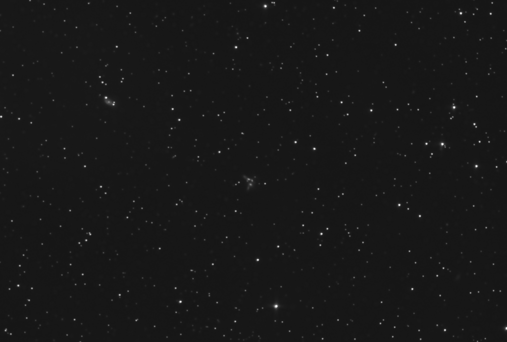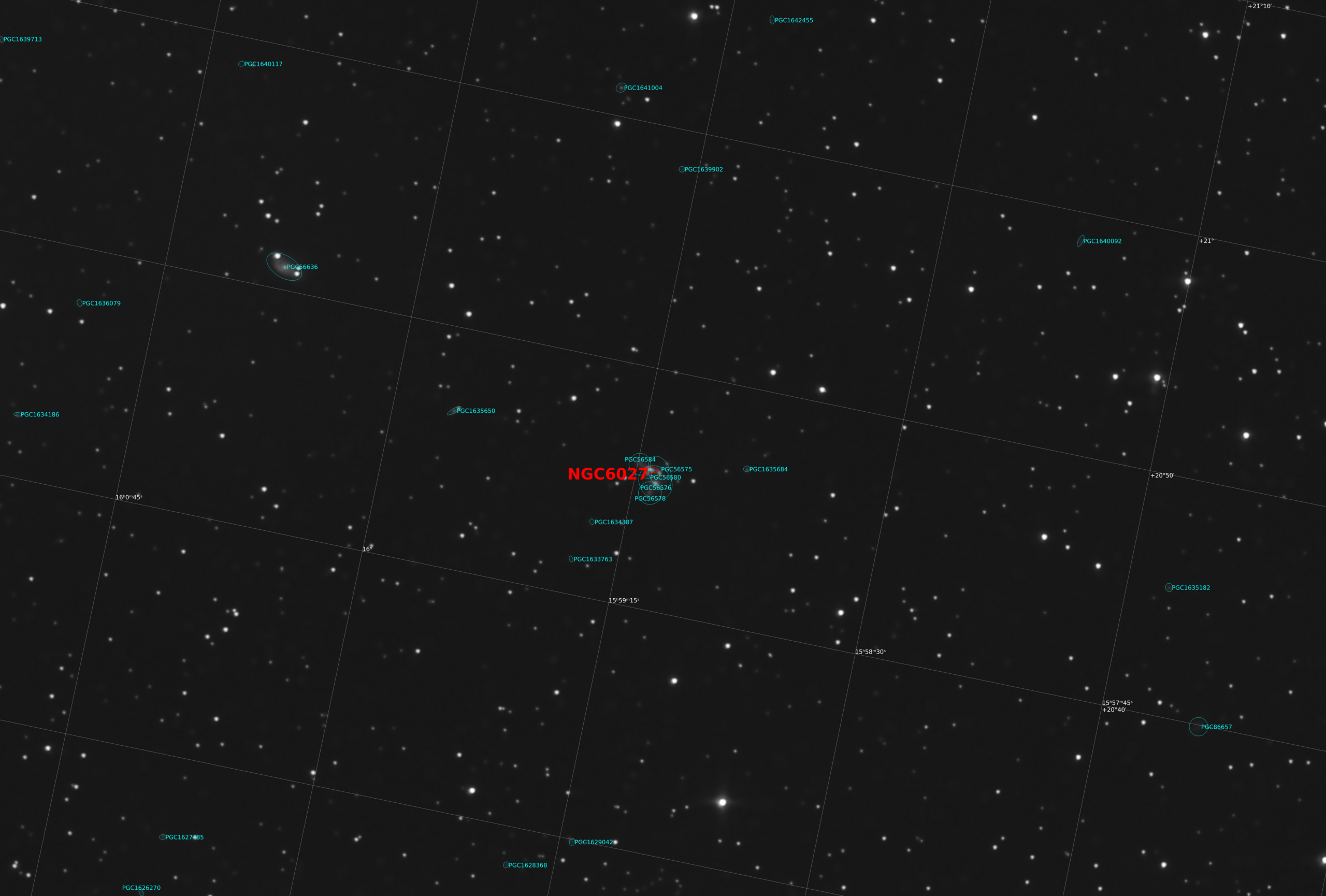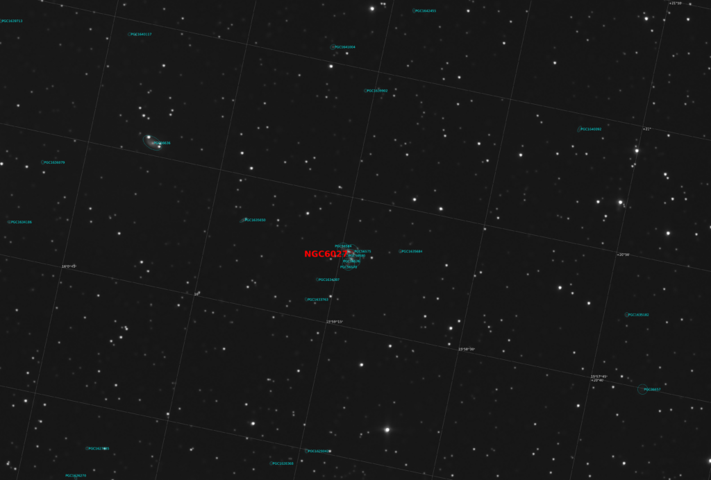 In the constellation of Serpens (Serpens Caput), approximately 190 million light-years away, lies NGC 6027, visible at the centre of the image, also catalogued as HCG 79 in Hickson’s compact group catalogue and commonly known as Seyfert’s Sextet: one of the most densely packed galaxy groups observable in the universe.