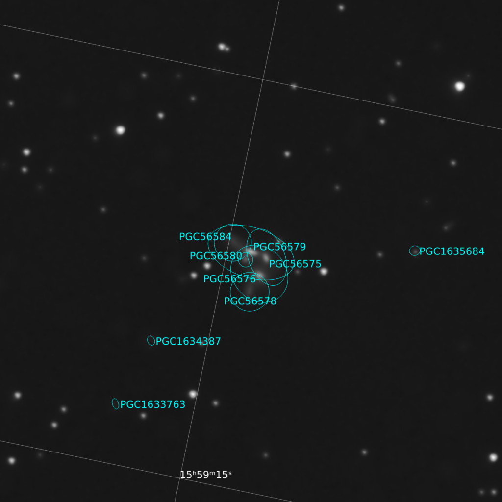 The name suggests six components, but the reality is more complex: only four galaxies are physically bound and mutually interacting, namely PGC 56575, PGC 56576, PGC 56584 and PGC 56578.